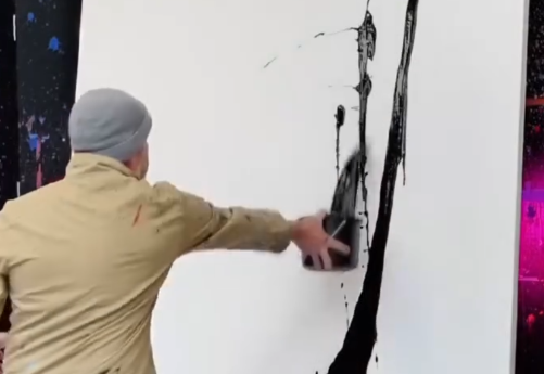 En la secuencia, el artista vierte directamente pintura líquida de diversos colores sobre el lienzo, luego moldea formas con los dedos, una paleta y movimientos controlados, guiado por una visión clara desde el inicio.
