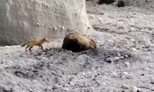 Las imágenes muestran cómo la zorra se acerca corriendo por detrás del oso mientras este cava un hoyo en busca de alimento. Con audacia, el pequeño cánido muerde al oso y luego retrocede rápidamente, repitiendo la acción varias veces como si se tratara de un juego. El oso, notablemente pasivo, apenas reacciona, permitiendo el peculiar intercambio.